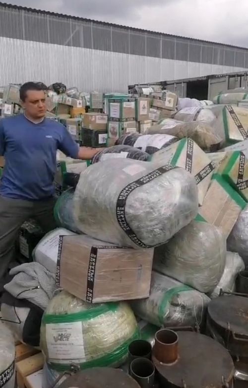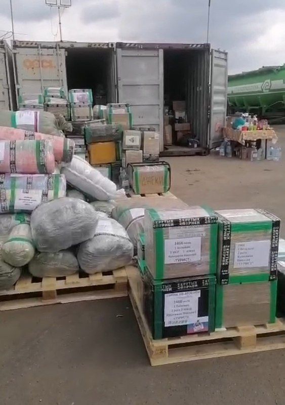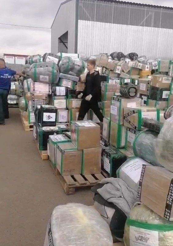 На фото: гуманитарный склад недалеко от линии соприкосновения, на котором разгружают помощь, привезённую группой «Своих не бросаем». Отдельно демонстрируют коробки с качественными медицинскими жгутами, которые выглядят немного непривычно.