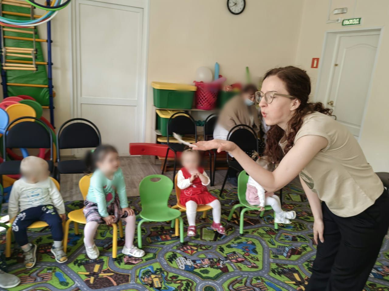 Ребята познакомились с Петрушкой, услышали сказку «Цыпленок» Корнея Чуковского, рассмотрели объемные иллюстрации в книге. Дети поиграли в сюжет этой истории: подбрасывали куриные перышки, дули на них, взлетали, как курочки, кормили цыплят червячками.