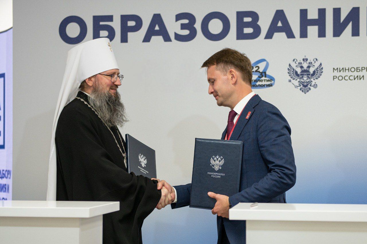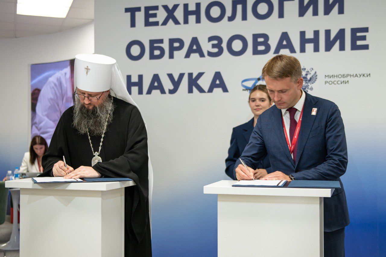 На профильном стенде Министерства образования и науки России ВЭФ-2025 состоялась церемония подписания Соглашения о сотрудничестве и обмене информацией между Владивостокской епархией Русской Православной Церкви и Дальневосточным федеральным университетом