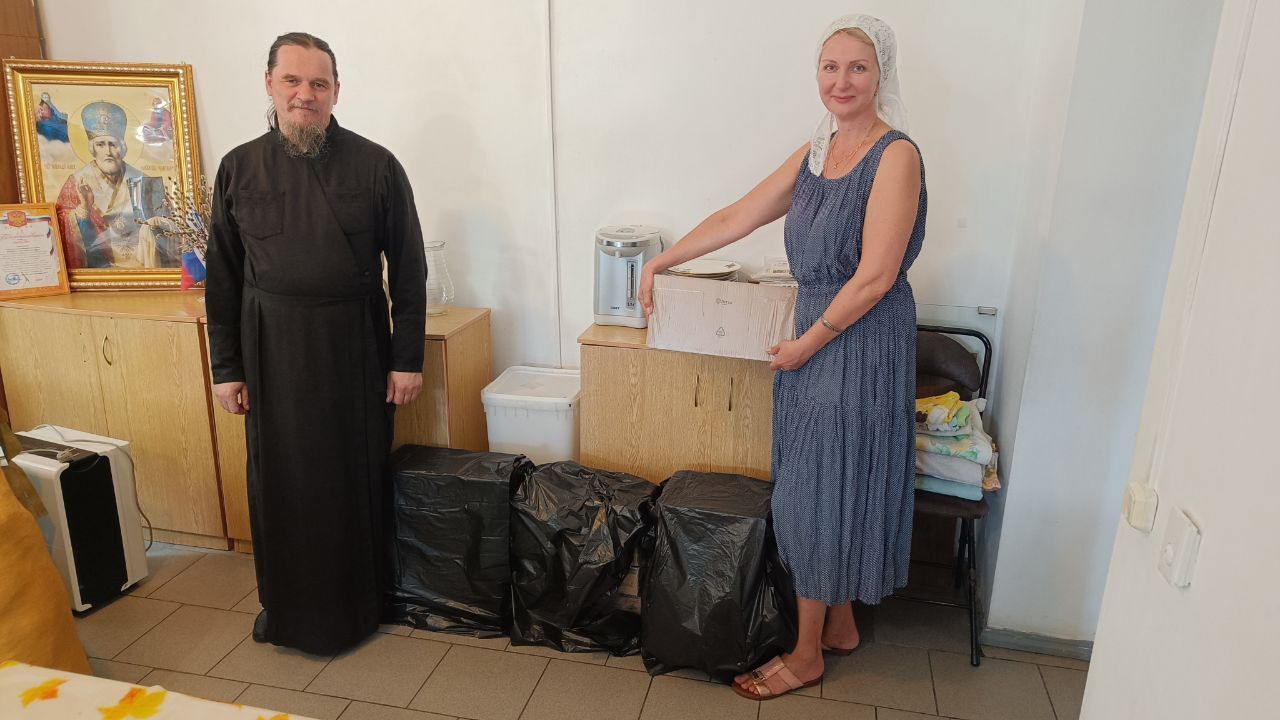 Сначала волонтёры посетили храм Иверской иконы Пресвятой Богородицы пгт. Смоляниново. Добровольцы встретились с настоятелем храма, иереем Алексием Пикулиным, который хорошо знает нужды малообеспеченных семей поселка. Отцу Алексию была передана первая часть гуманитарной помощи: коробки со средствами личной гигиены и соки для детей.