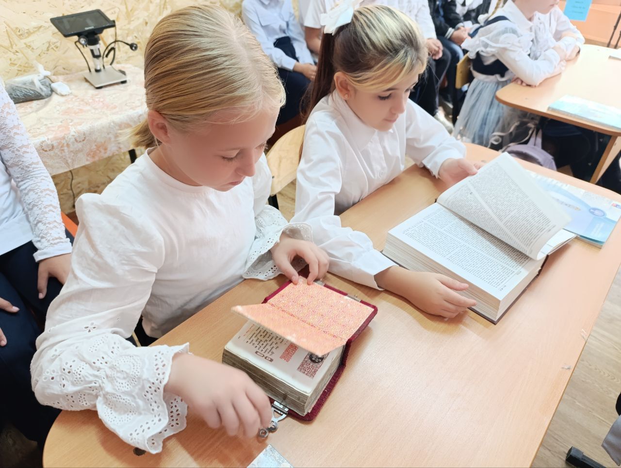 Отец Владимир уже не первый раз выступает перед детьми в данном учебном заведении в рамках школьного курса «Основы православной культуры». Батюшка начал урок словами из Евангелия от Иоанна: «Исследуйте Писания, ибо вы думаете чрез них иметь жизнь вечную; а они свидетельствуют о Мне» (Ин. 5, 39). Ученики ознакомились с принесёнными из храма Библией, Псалтирью и Четвероевангелием. Отец Владимир рассказал не только о Священном Писании Ветхого и Нового Завета (структуре, месте, времени написания и другой интересной информации), но и о Святой Троице, Господе Иисусе Христе, Крестной смерти и Воскресении, евангельских заповедях и спасении людей. В конце встречи священник ответил на вопросы ребят и угостил их просфорами из храмовой пекарни.