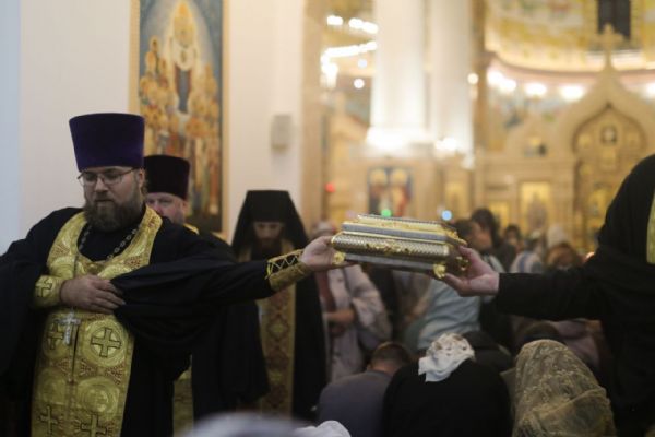 После молебна владыка Иннокентий обратился к верующим со словом, в котором выразил радость от пребывания в соборе этих великих святынь. Затем с пением величания ковчег с частицей Пояса и святыми мощами был вынесен из собора и передан иерею Владимиру Плотникову, настоятелю храма Покрова Пресвятой Богородицы г. Владивостока, где святыня пребывала до утра 7 октября.
