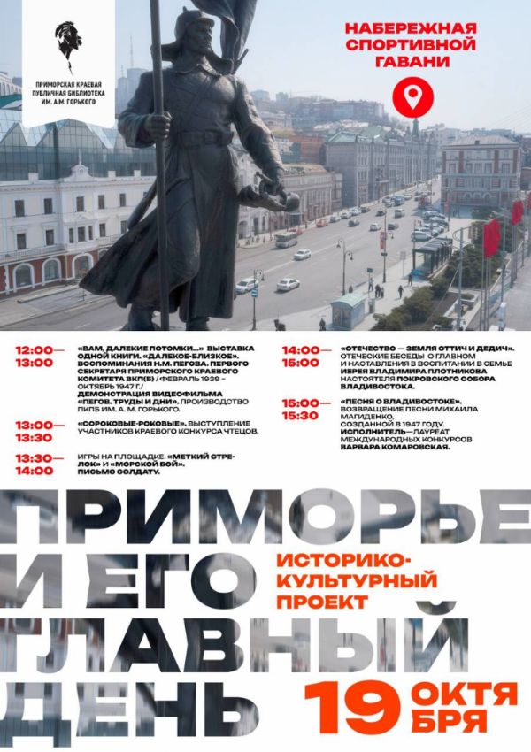 19 октября, в День отца и накануне Дня Приморского края, в павильоне на набережной Спортивной гавани состоялось выступление настоятеля Покровского собора иерея Владимира Плотникова под названием: "Отечество — земля оттич и дедич". Мероприятие прошло в рамках проекта "Приморье и его главный день" Приморской краевой библиотеки им. А.М. Горького. Организатором встречи стал Сергей Семёнов, заведующий Центром культурных программ.