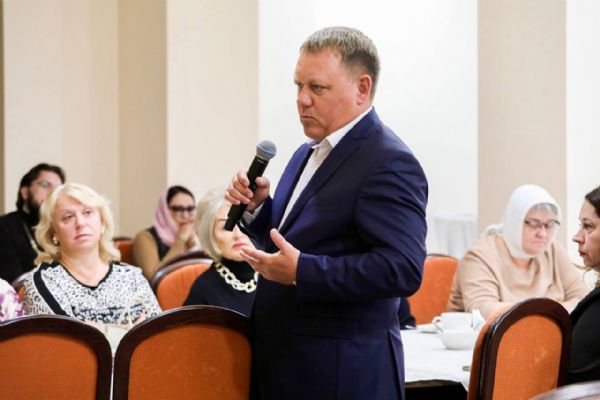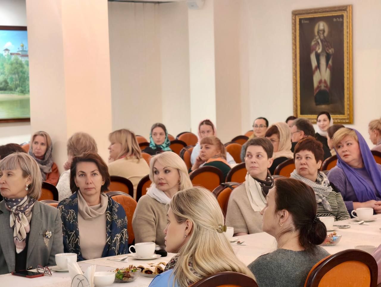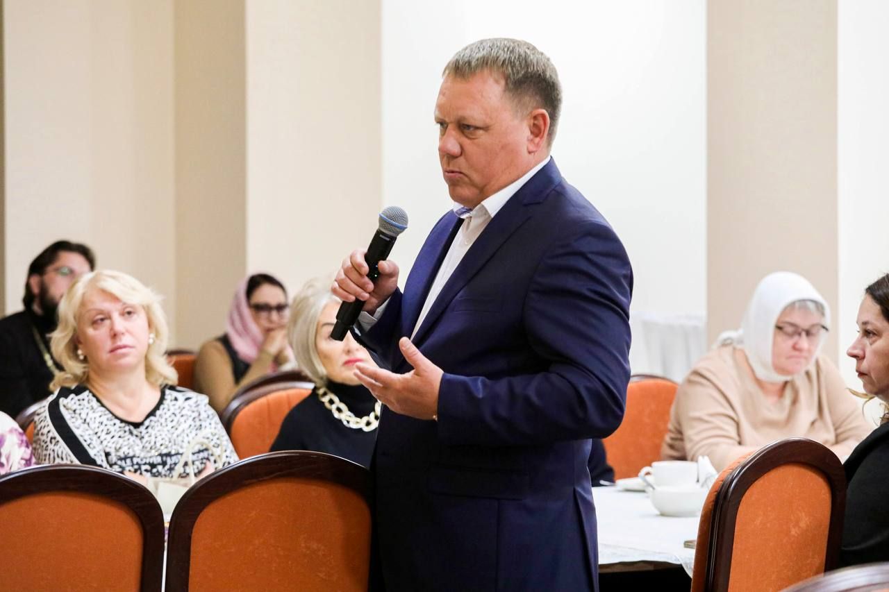 Разговор продолжился в трапезной. С приветственным словом выступили матушка Яна Цуркан, директор АНО «Центр защиты семьи, материнства и детства «Колыбелька», и иерей Владимир Ковальчук, руководитель епархиального отдела по вопросам семьи, защите материнства, отцовства и детства. Матушка Яна и отец Владимир рассказали о своей просветительской деятельности в учреждениях нашего края и о работе с детьми в вопросах семьи и духовно-нравственного воспитания.