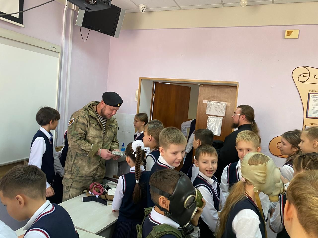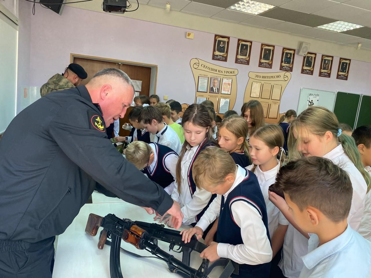 На втором уроке бойцы показали оружие и амуницию. Ребята смогли всё рассмотреть, потрогать руками и даже примерить бронежилет.