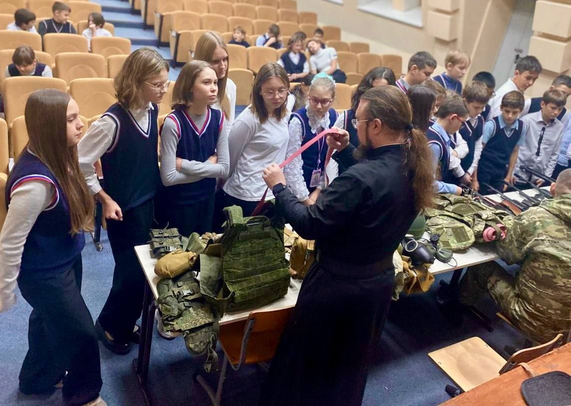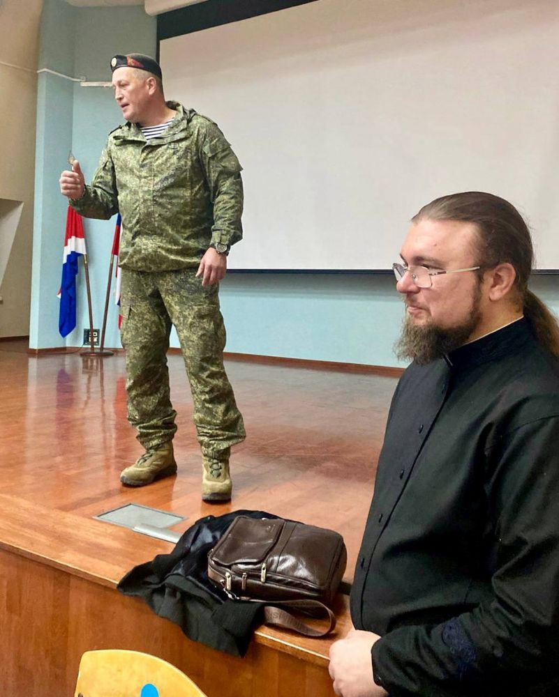 Инок Дионисий, клирик храма Казанской иконы Божией Матери г. Владивостока, совместно с военнослужащими 155-ой бригады морской пехоты, ветеранами СВО и участниками «Союза морской пехоты и ветеранов боевых действий» посетил СОШ №6 г. Владивостока