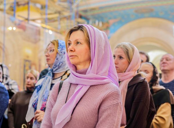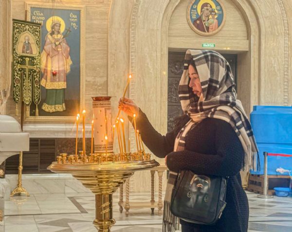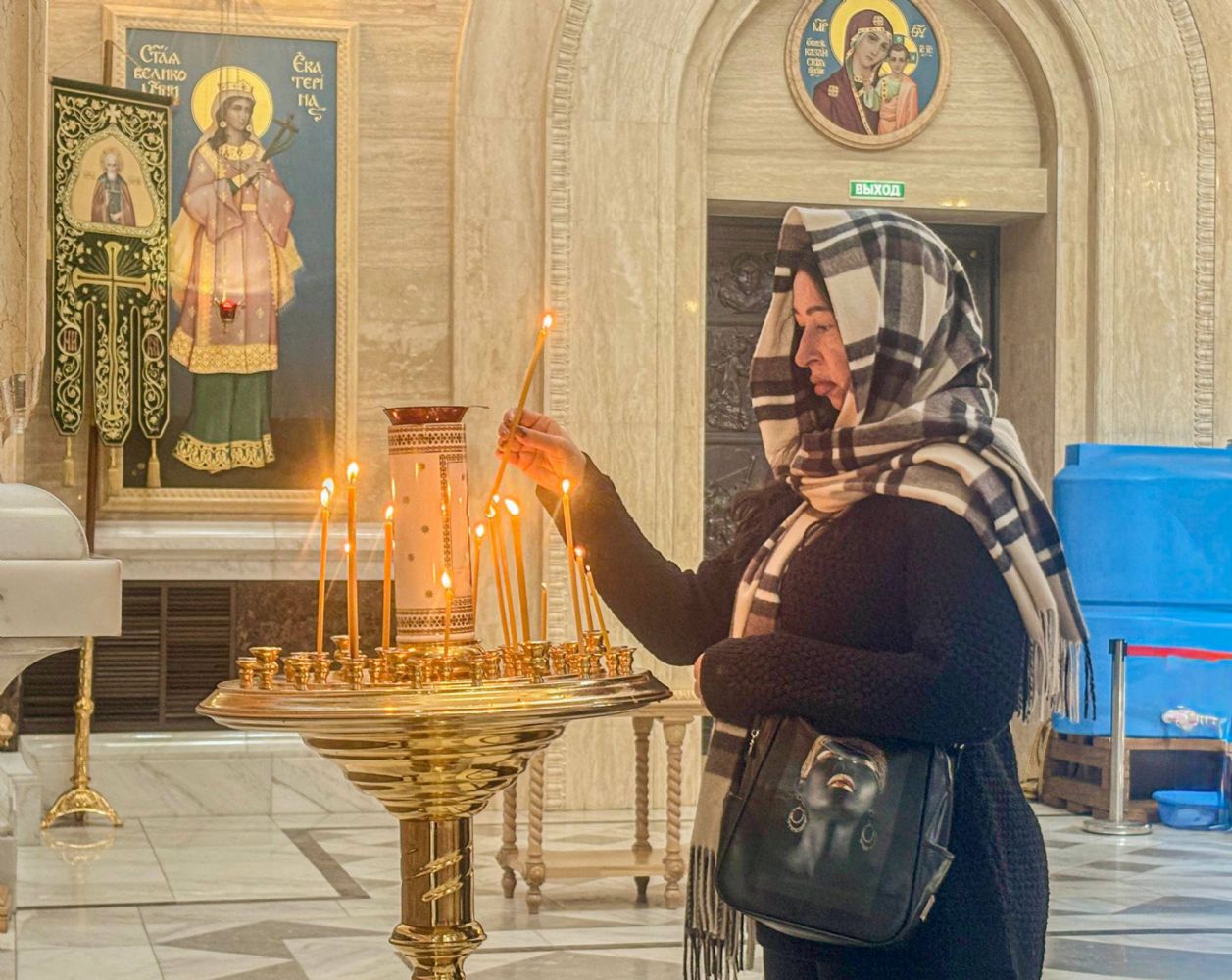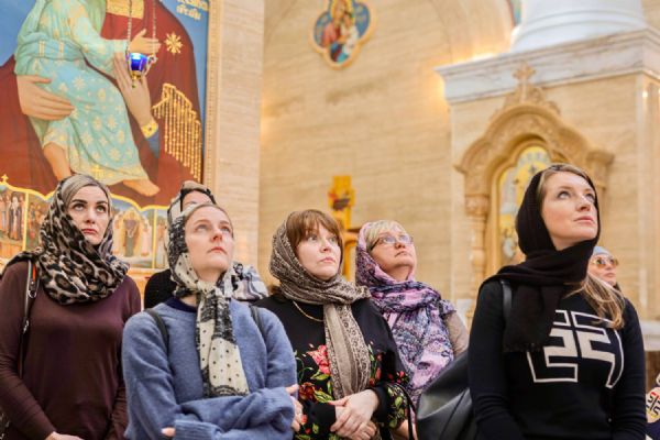 Еще перед началом экскурсии некоторые сотрудники поставили свечи перед лежащей на центральном аналое иконой Собора вселенских учителей и святителей Василия Великого, Григория Богослова и Иоанна Златоустого, память которых вчера чтила Православная Церковь, и перед Владимирской иконой Божией Матери. Гости с нескрываемым интересом рассматривали убранство и святыни кафедрального собора, делились впечатлениями о храмовой росписи и евангельских сюжетах, изображенных на фресках.
