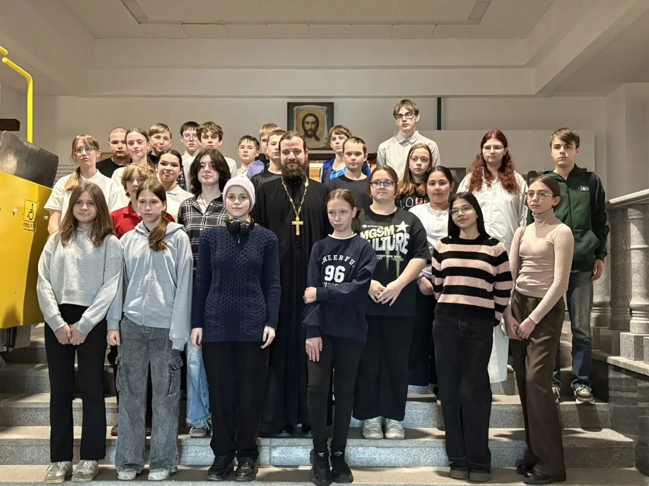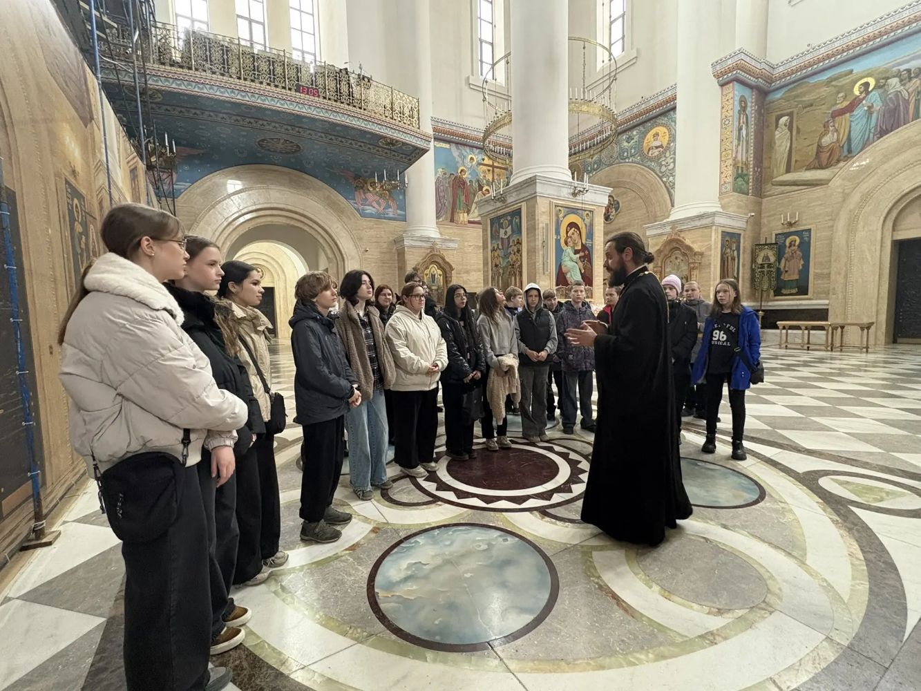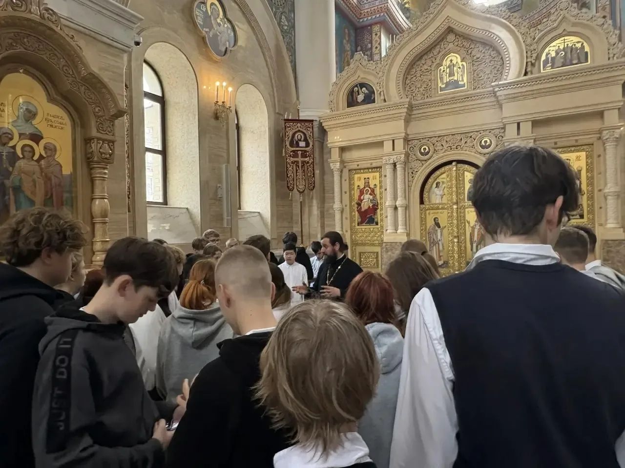 Экскурсию для ребят провёл иерей Владимир Ковальчук, руководитель епархиального отдела по вопросам семьи, защите материнства и детства. Батюшка познакомил школьников с устройством храма, рассказал о необходимости стяжать добродетели и важности уважительных отношений между юношами и девушками.