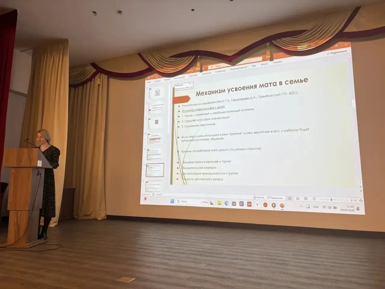 Затем встреча продолжилась в зале Церковных собраний, где Виктория Дорохина, руководитель АНО «Колыбель», провела с детьми беседу о вреде нецензурной речи. Виктория подчеркнула, что сквернословие негативно сказывается на семейных отношениях и воспитании детей. Её слова подкрепил показ фильма, посвящённого разрушительному влиянию бранных слов.