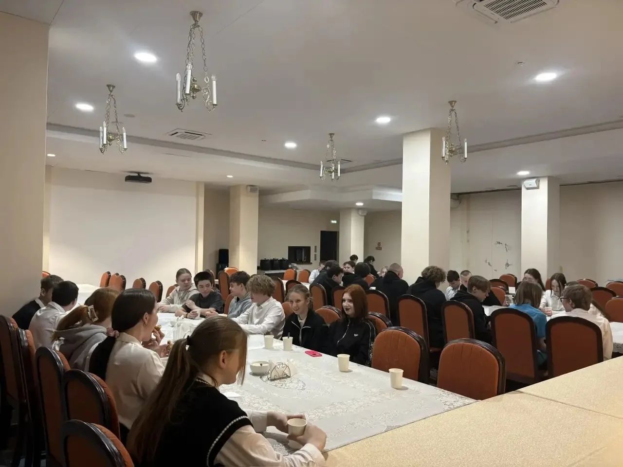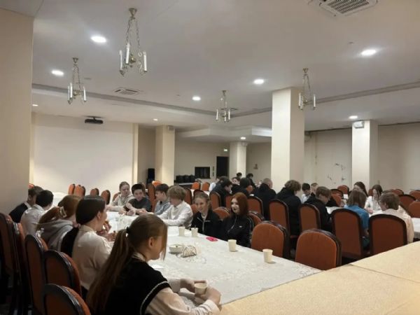 В завершение мероприятия все собрались в трапезной за чашкой чая и выпечкой, предоставленной компанией «Владхлеб». Ребята поделились с батюшкой своими школьными успехами, а отец Владимир рассказал о своём жизненном и духовном пути и ответил на интересующие вопросы.