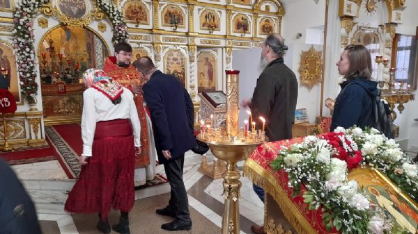 Знакомство с храмом началось с участия в праздничной Божественной литургии. Вместе с первокурсниками в стенах храма молились преподаватели кафедры и студенты старших курсов. После богослужения и традиционного пасхального чаепития учащиеся приступили к углубленному изучению устройства и быта прихода.
