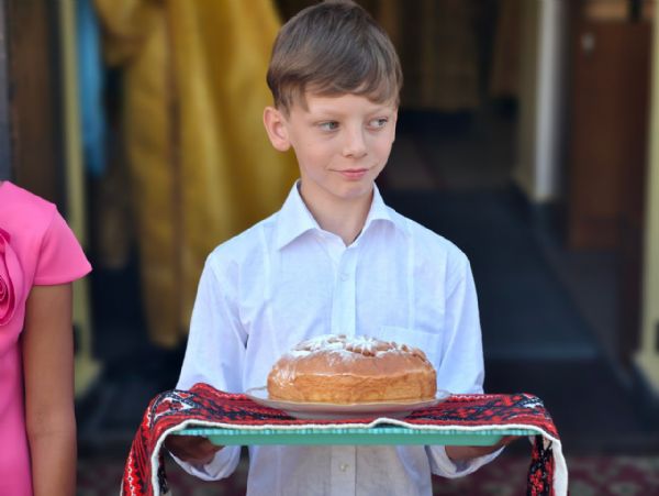 На входе в храм юные прихожане встретили архиерея хлебом-солью. Владыка благословил детей и всех пришедших на воскресное богослужение.