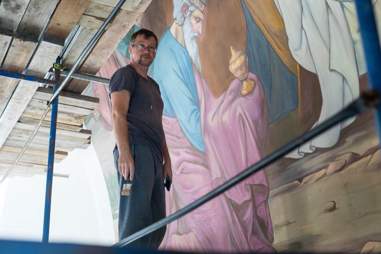 Этажом выше встречаем Сергея Томилова, художника из Петербурга. К творческому коллективу мастерской «Ковчег» присоединился недавно, две недели назад. Ему поручено писать образы святых на полуколоннах. Расписывает храмы около 30 лет, предпочитая эту работу келейной иконописи. Говорит, что нравится видеть масштабную «3D-развёртку» святых образов.
