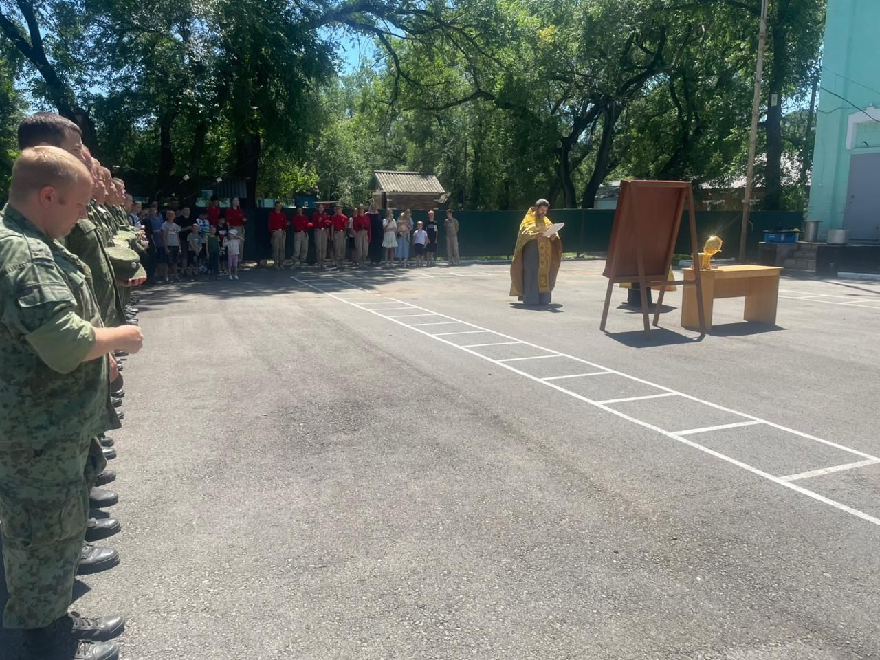 Молебен на плацу заставы совершил благочинный Уссурийского благочиния, руководитель епархиального отдела по взаимодействию с казачеством протоиерей Андрей Машанов. Благочинному сослужил настоятель храма Покрова Пресвятой Богородицы с. Покровка протоиерей Димитрий Федорин.