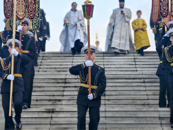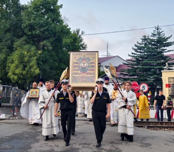Икона «Собор святых покровителей воинства российского» прибыла на военном катере из Свято-Серафимовского мужского монастыря на о. Русский в сопровождении его настоятеля, игумена Климента. На причале встречающие приложились к иконе, а затем обратным крестным ходом доставили святыню в Спасо-Преображенский кафедральный собор.