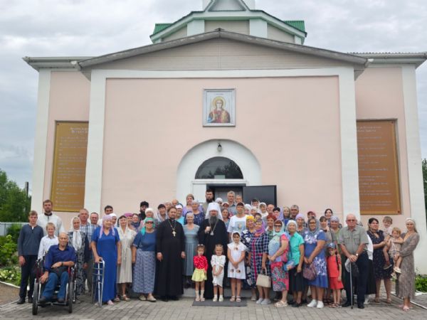 После проповеди отец Глеб с благодарностью за архипастырский визит и совместные молитвы вручил владыке букет цветов, а затем все присутствующие сфотографировались с правящим архиереем на фоне храма.