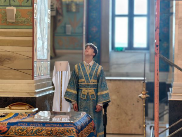 Во время всенощного бдения владыка Павел и клирики собора благоговейно изнесли из алтаря и разместили в центре храма для целования верующими Плащаницу Пресвятой Богородицы. Изнесение Плащаницы из алтаря символизирует погребальную процессию, в которой в далеком I веке участвовали Апостолы Христовы, а ныне к ним духовно присоединяются все, любящие Матерь Божию. Вынос этой святыни происходит только раз в год. Плащаница будет пребывать в центре храма до завтрашнего вечера, когда будет совершен Чин погребения Плащаницы Пресвятой Богородицы.