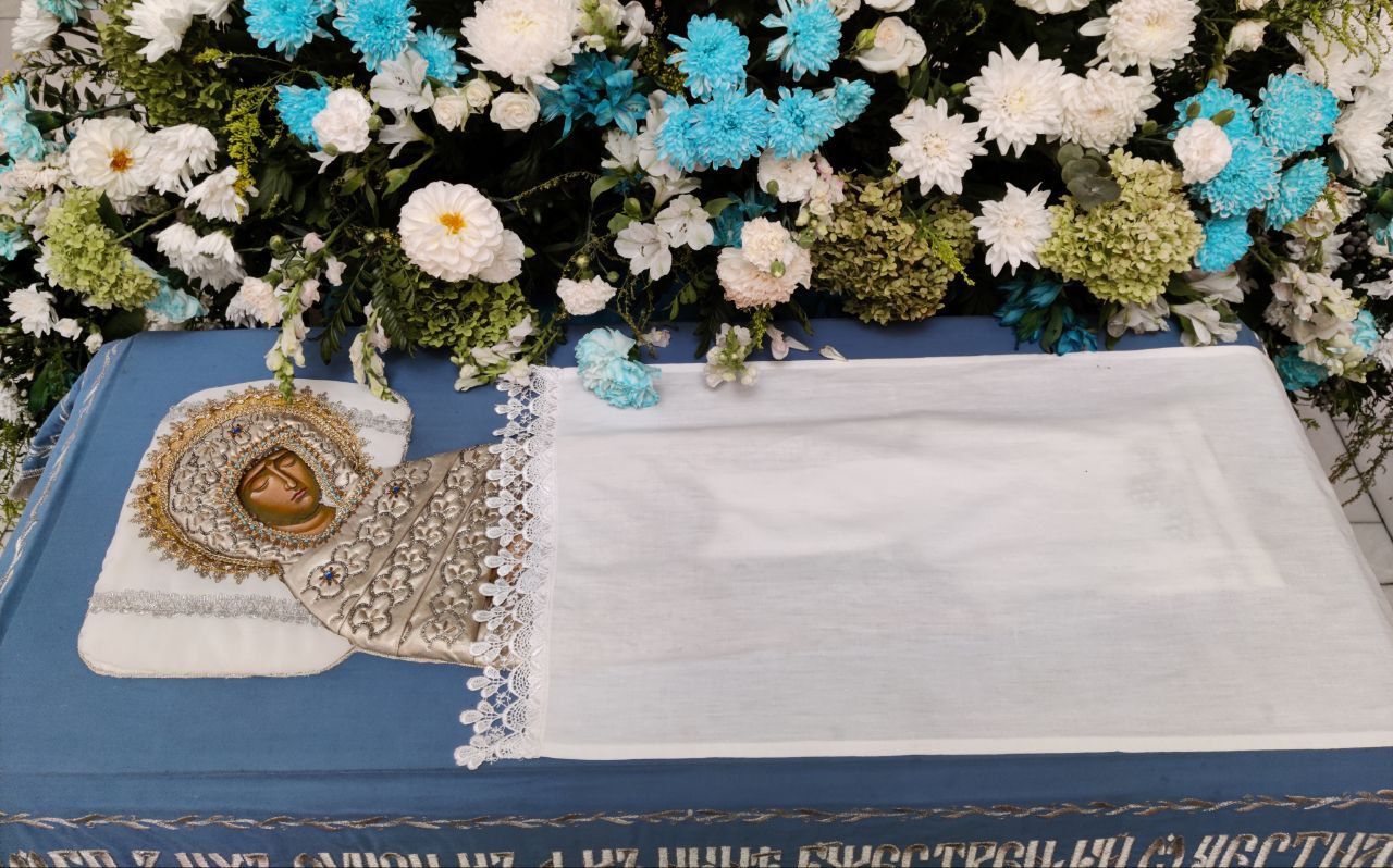 В центре храма, на украшенном множеством цветов ложе, располагается Плащаница Пресвятой Богородицы. К ней с благоговением и любовью прикладываются сегодня все молящиеся.