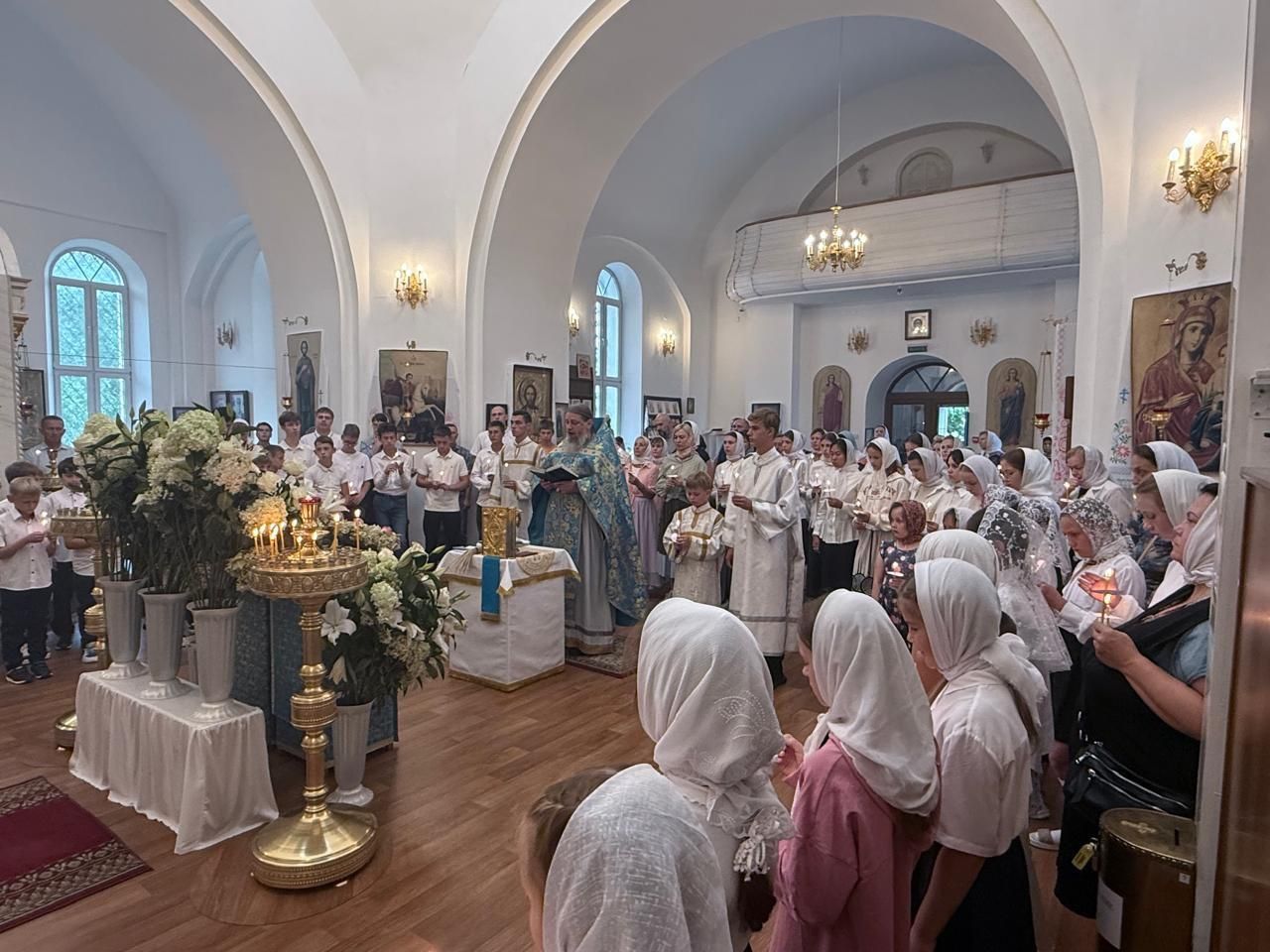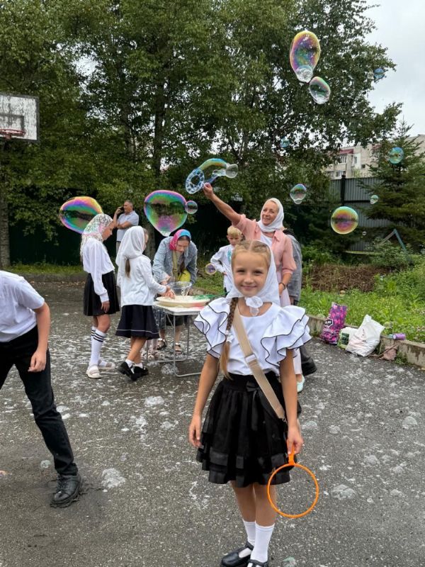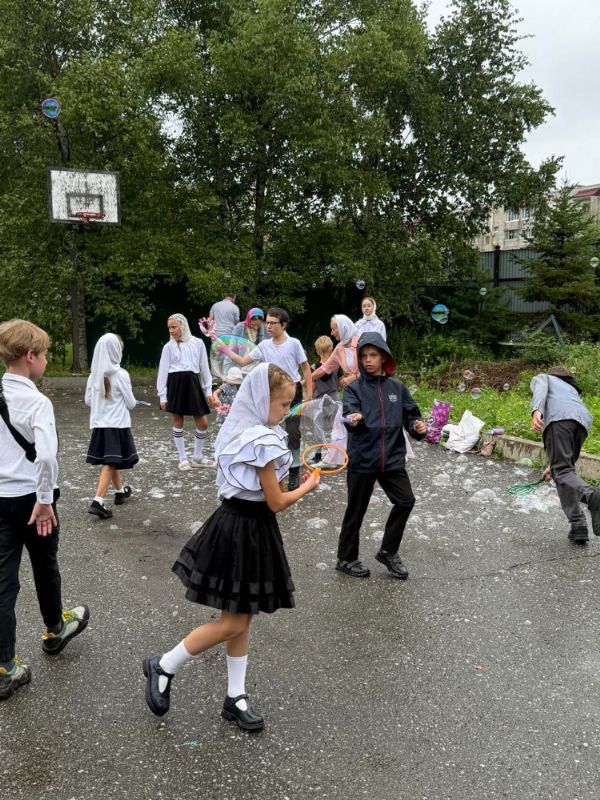 По благословению настоятеля после службы на территории храма был организован праздник для учащихся с трапезой. Несмотря на дождливую погоду, ребята весело провели время, играя с мыльными пузырями и воздушными шарами.