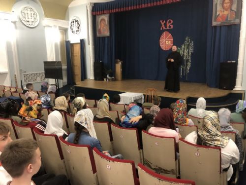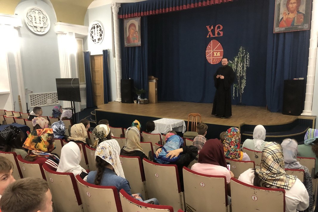 Далее знакомство продолжилось в храме в честь святителя Николая Японского. Инок Дионисий, который проводил экскурсию, рассказал об этом удивительном святом. Далее ребят пригласили в актовый зал, который остался от бывшего кинотеатра. Инок Дионисий рассказал о мероприятиях, проходящих в этом зале. Особое внимание он уделил рассказу о встречах с офицерами СВО, которые встречались с прихожанами храма.