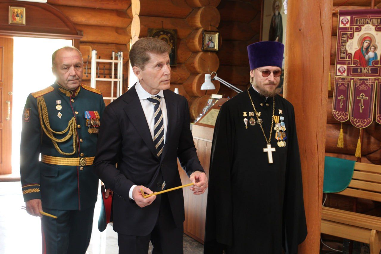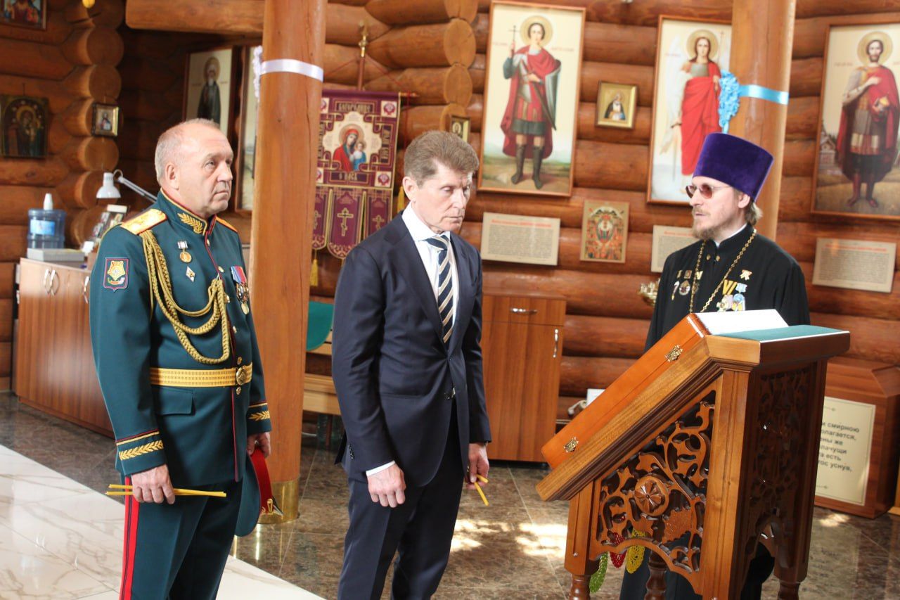 В завершении мероприятия губернатор края посетил храм училища, где ознакомился с историей его строительства, внутренним убранством. Олег Николаевич помолился о приморцах, выполняющих свой воинский долг в зоне проведения СВО и о тех соотечественниках, кто погиб на полях сражений.